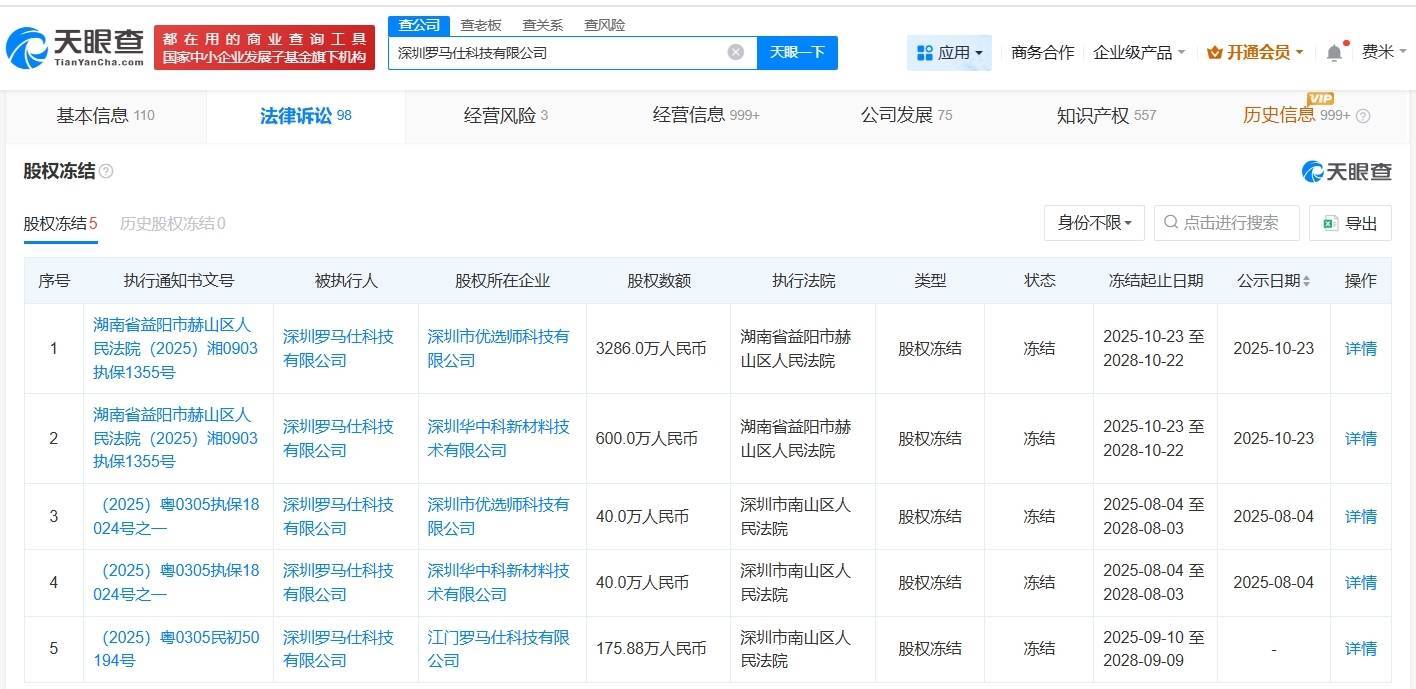 【大河财立方消息】天眼查天眼风险信息显示,近日,深圳罗马仕科技有限公司新增两则股权冻结信息,股权所在企业分别为深圳市优选师科技有限公司、深圳华中科新材料技术有限公司,冻结股权数额合计3886万人民币,冻结期限均为三年,执行法院均为湖南省益阳市赫山区人民法院。